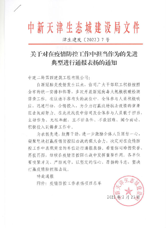 近日,公司收到來自中新天津生態(tài)城建設局的文件。文件對公司天津貽成學府項目在疫情防控工作中主動擔當作為的突出表現給予肯定。
