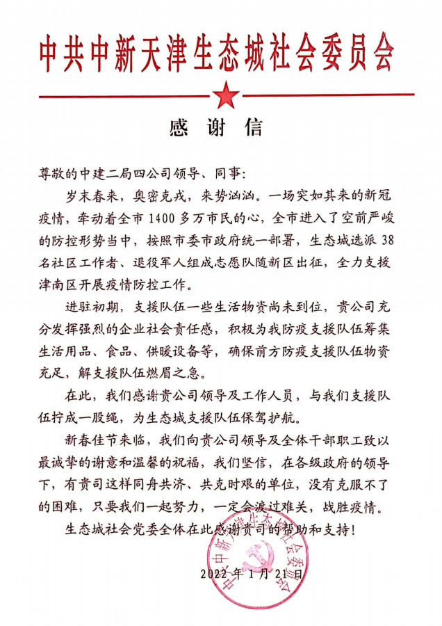 近日,公司收到來自共青團(tuán)天津市濱海新區(qū)委員會和中共中新天津生態(tài)城社區(qū)委員會的表揚(yáng)信,信中對公司積極為疫情防控一線工作者捐贈物資的行為給予了充分肯定和贊揚(yáng)。